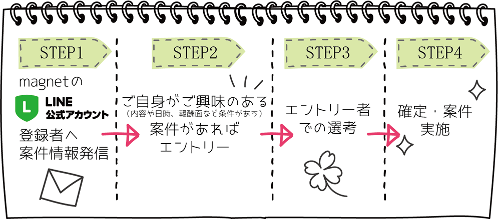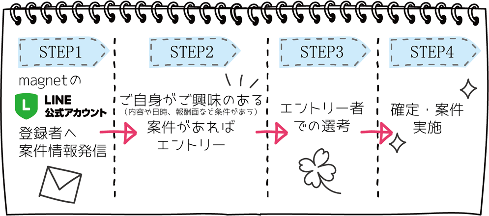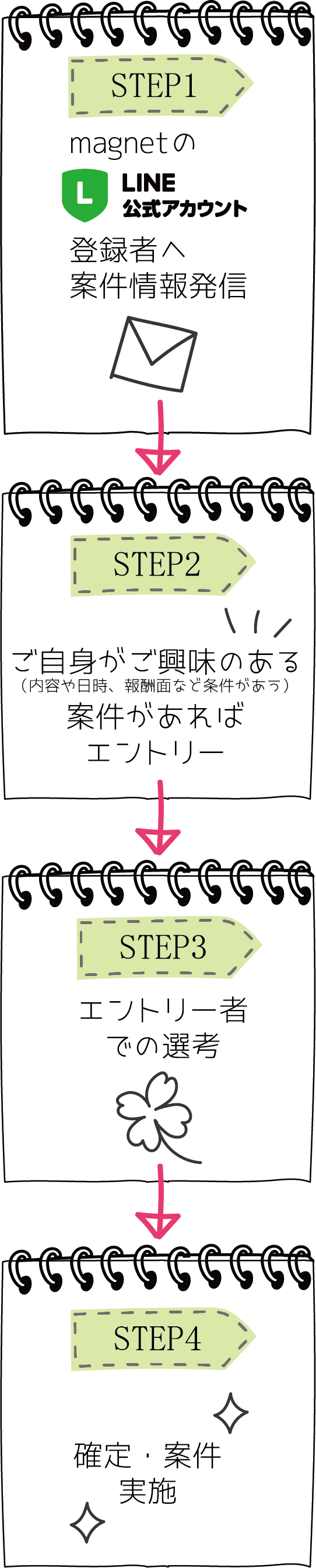 登録者にはLINE@にて、モデル撮影やSNS発信(インフルエンサー)など案件の情報発信を致します。ご自身でご興味が有る案件のみのエントリーをする事が可能になります。